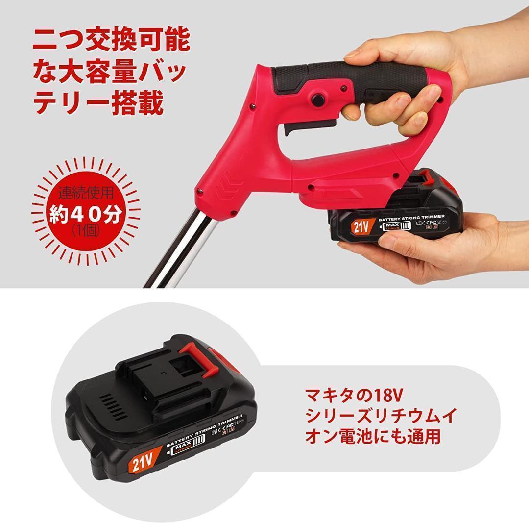 充電式だからコンセントがない場所でも電源を気にせずどこでも草刈りが可能。2個の取外し可能な21Vリチウム充電電池パックを搭載して、約80分の連続運転が可能、長時間使用できるので広範囲の刈り込みに大活躍します。