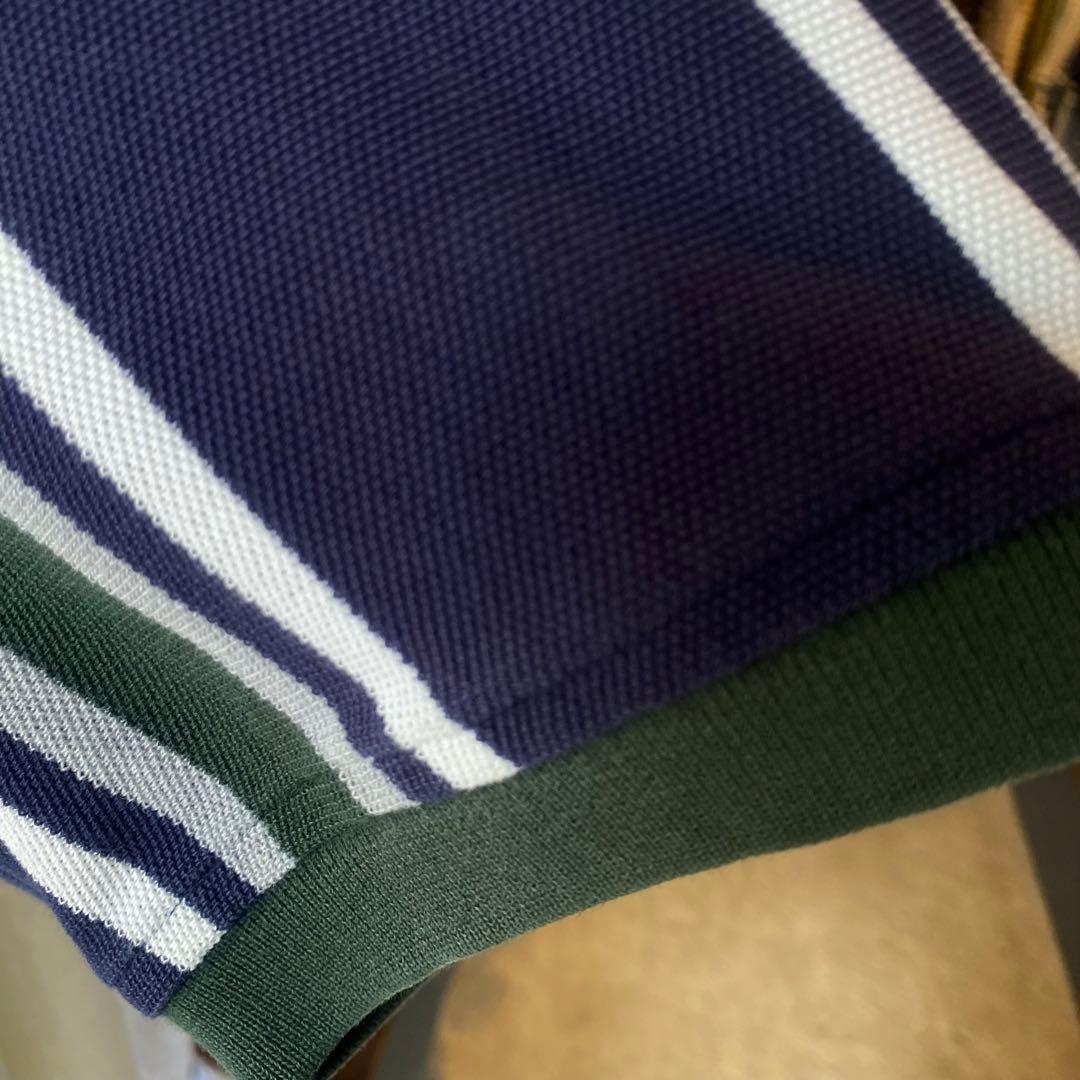 ネイビー×ホワイト×グリーンのストライプ柄のポロシャツです。
