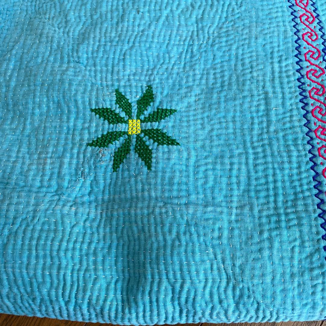とても綺麗なターコイズブルーのカンタキルトカバーです。可愛いです。畳んで保管しておりました。色は画像8が一番近いです。大きさはおおよそ140✖︎197くらいです。
