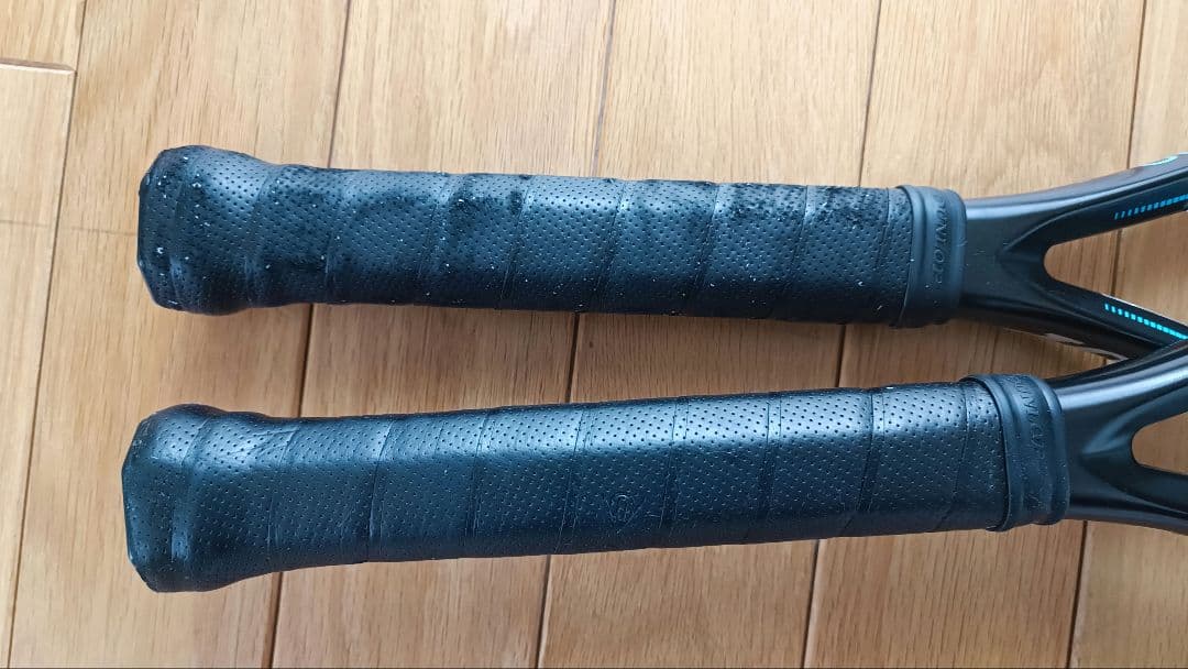 オーバーグリップを巻いて使っていました。元グリップは写真の通りです。オーバーグリップを巻けば問題ありませんが、表面の傷みは若干ありますので、オーバーグリップを巻かずに使う場合、気になる方は交換してお使いください。ガットは今年初め頃に張ったものです(テクニファイバーTGV黒とHDMX黃)。数ヶ月経過してますので、張替をお勧めします。一緒に使用していたソフトケースをひとつオマケでお付けします。ダンボールとプチプチで梱包して発送いたします。