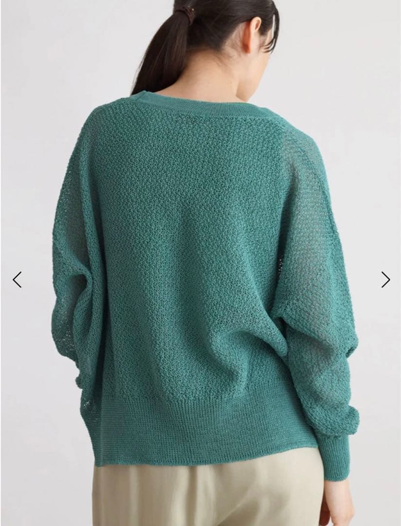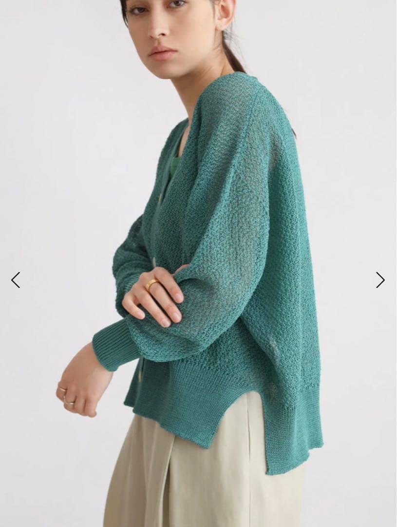 清涼感のある透かし編みが抜け感を演出する1着。袖口の緩やかなドルマンスリーブが女性らしい印象へと導き、光沢感のあるフロントボタンが上品さをプラス。インナーにキャミソールなどを取り入れ、ヘルシーな肌見せをするコーデがオススメ。ベーシックなオフホワイト、ブラックに加え、春らしいトレンド感のあるグリーン、ライトパープルの4色展開です。